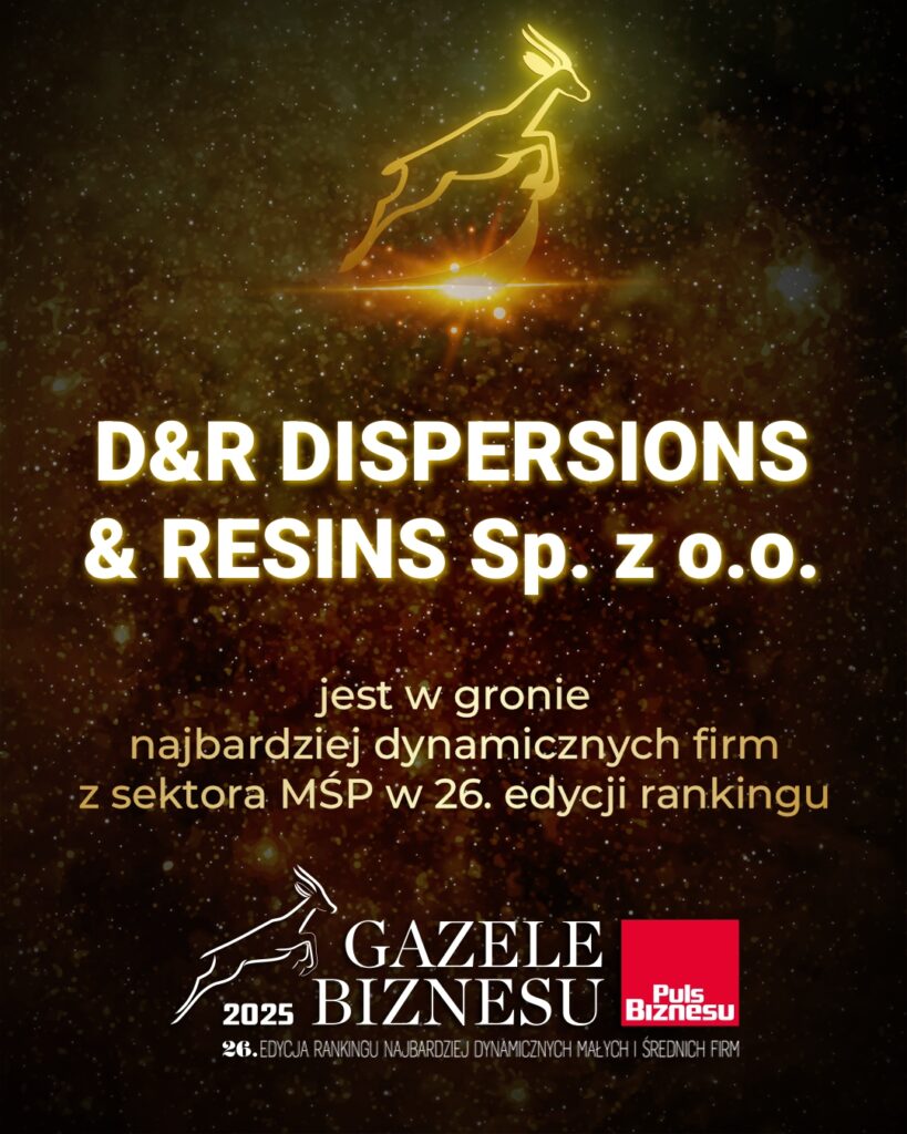 D&R Dispersions and Resins znalazł się w rankingu Gazele Biznesu 2025, który od lat wyróżnia najdynamiczniej rozwijające się przedsiębiorstwa w Polsce. Ranking tworzony jest na podstawie wyników finansowych firm i stanowi jedno z najbardziej rozpoznawalnych zestawień kondycji sektora MŚP.
